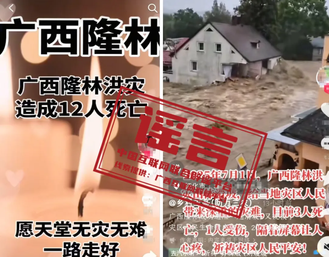 详情:7月3日,有网民在短视频平台发布视频称“广西隆林洪灾造成12人死亡”“2025年7月1日,广西隆林洪灾山体滑坡,给当地灾区人民带来深重的灾难,目前3人死亡,1人受伤”,引发关注。经广西隆林各族自治县应急管理局核实,上述信息系谣言。6月30日至7月1日的强降雨造成隆林7条街道被淹、5处内涝,冲毁道路36.17公里,600余户房屋受损,紧急转移避险476人,但并无人员伤亡。目前,全县灾后恢复工作有序展开。(来源:“广西互联网违法和不良信息举报”微信公众号)