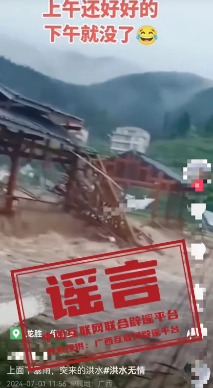 详情:近日,有网民发布视频称“桂林龙胜一风雨桥被洪水冲毁”,并配文“上午还好好的,下午就没了”,引发关注。经当地公安部门核实,伟江乡辖区内风雨桥完好无损,不存在倒塌的情况。该视频系当地网民龙某某罔顾事实、故意编造,将网上看到的其他地方的风雨桥被毁视频重新编辑并定位在伟江乡进行发布。目前,警方已依法对龙某某予以行政处罚。(来源:广西互联网辟谣平台、龙胜公安)