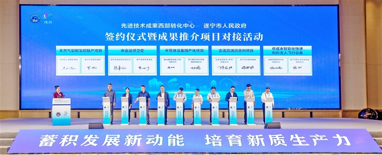 以科技创新开辟发展新领域新赛道、塑造发展新动能新优势,既是大势所趋,也是发展所需。当前,先进技术成果西部转化中心集聚了各类高技术成果1.3万余项,成为先进技术成果双向转移转化的“桥头堡”。活动中,西部转化中心与遂宁经开区管委会签署共建“遂宁基地”合作协议,西部先进技术成果转化(成都)有限责任公司与遂宁产业投资集团签署共建产业发展基金战略合作协议。