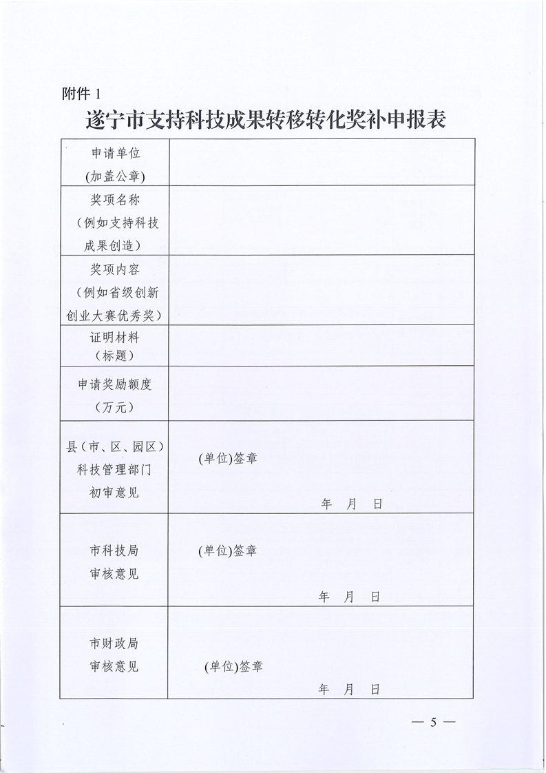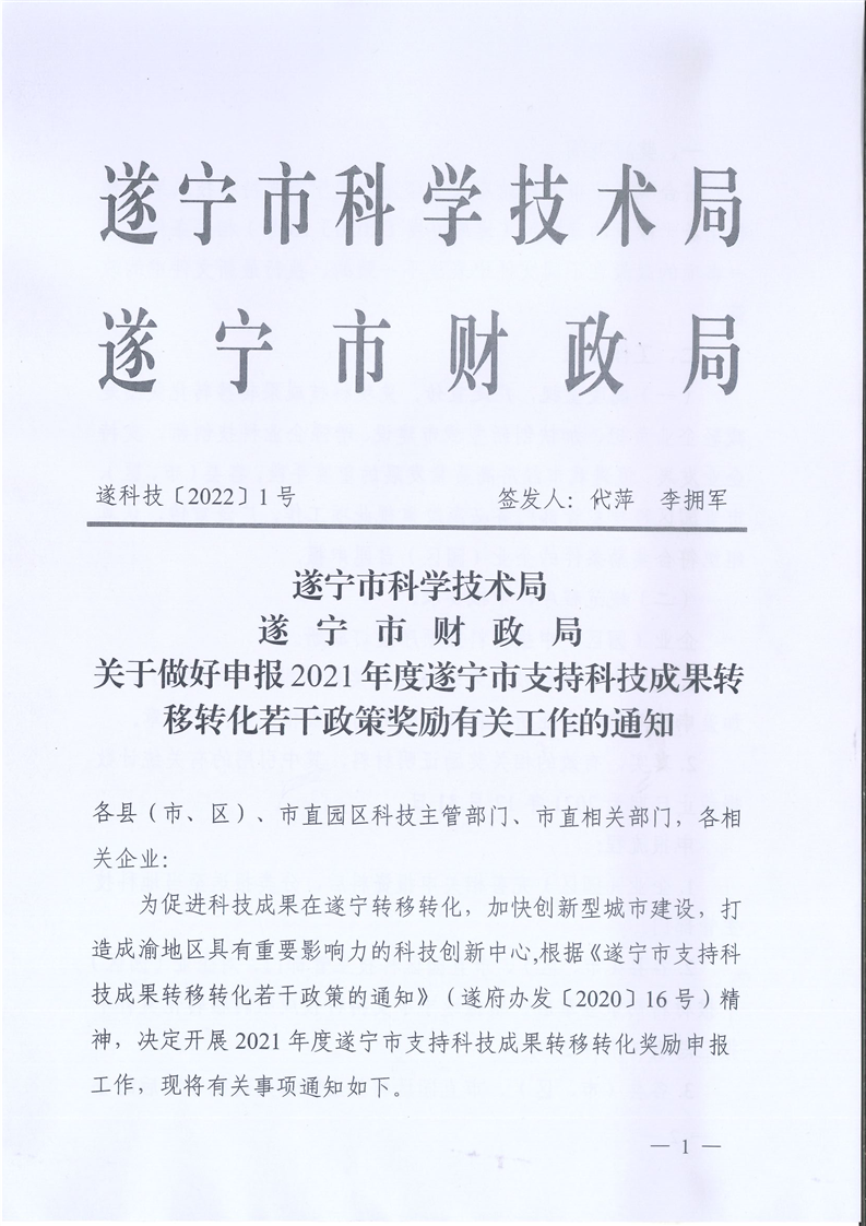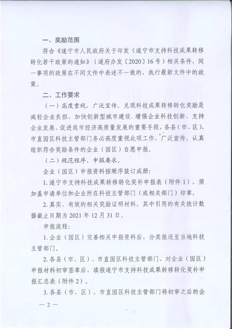 关于做好申报2021年度遂宁市支持科技成果转移转化若干政策奖励有关工作的通知